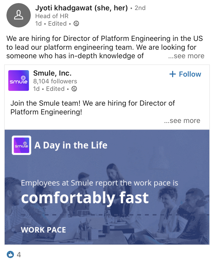 The team and I built robust functionalities that helped engaged companies’ internal employees to share with one-click shareable link, destination URL with webre.direct to drive traffic to webpages they desire, integration with Slack and Microsoft Teams to meet users where they are, and more content option such as verified employee reviews (segmented into gender, departments, categories), verified employee stats from surveyed current employees, gif & videos, company awards and culture scores, and to the fully customizable editor with animated background images and more.